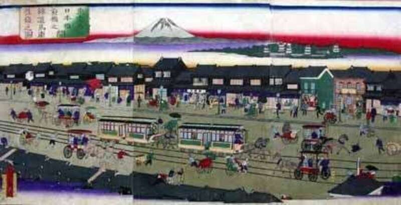 (POSSIBLY) KOUEISAI (JAPANESE) FAMOUS PLACES IN TOKYO, HORSE DRAWN TRAINS TRAVELLING BETWEEN NIHONBASHI AND KYOUBASHI