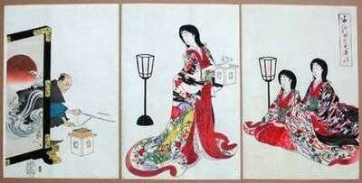 1896 (Meiji 29), signed Yoshu Chikanobu and with publisher's seal; Fukuda Kumajiro, publisher. Color woodcut triptych.
