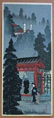 This print has all of the compositional elements of Shotei's Inari Shrine at Oji and clearly depicts the Inari Shrine at Oji, but is inscribed as Inari Shrine at Handa, Kanamachi. It is unsigned with the red Hokusai seal, a house that is known for recreating popular Shin-hanga images.