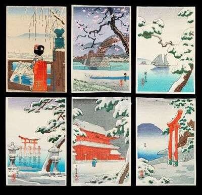 TSUCHIYA KOITSU (JAPANESE 1870-1949)SIX POSTCARD COLOR WOODCUTS KYOTO;KINTAIBASHI;MAIKO NO HAMA;MIYAJIMA;NIKKO CHÛZENJI; andSHIBA ZÔJÔJI