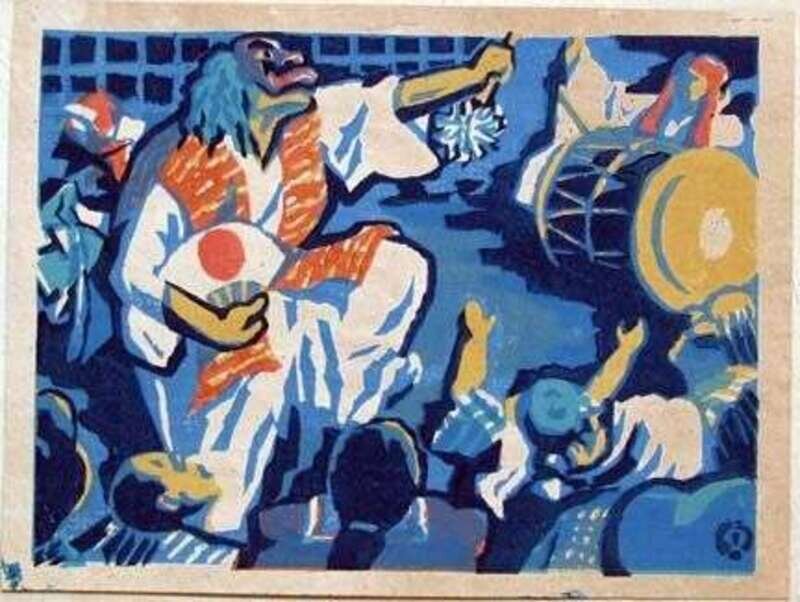 SADAO KUROKI, MASAO MAEDA,DOSHUN MORI, &JUNICHIRO SEKINO FOUR COLOR WOODCUTS FROM THE SERIES OF TWELVE NIHON MINZOKU ZUFU (SERIES):IWATO KAGURA PLAY;OSHIMA ANKO;TANABATA MATSURI IN HIDA; andSNOW ROOM