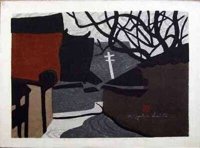 1954 signed Kiyoshi Saito in white ink and with artist's seal in the image; pencil dated, titled, and numbered 52/100 in the margin; with Kiyoshi Saito watermark. Additional artist's seal, verso. Color woodcut.