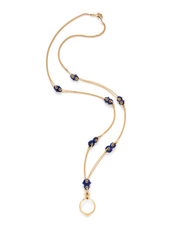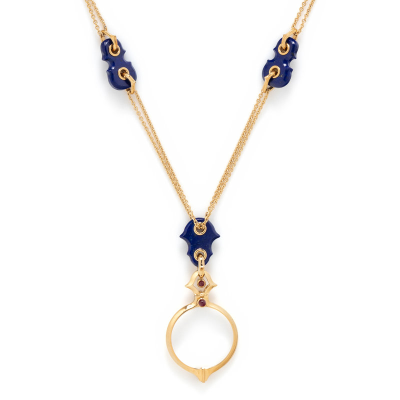 Containing a long double cable link gold chain with lapis lazuli spacers, suspending a magnifying glass with cabochon ruby detail. 36 inches long.