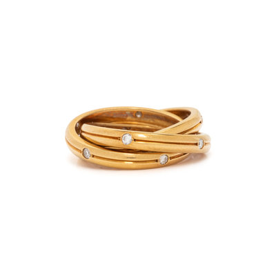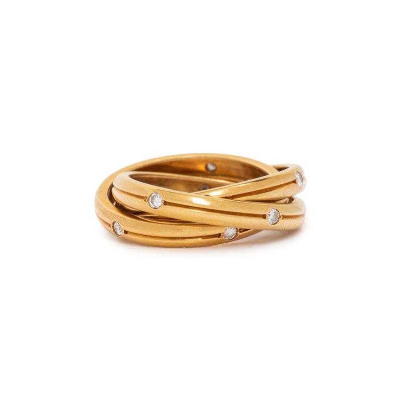 Containing three gold interlocking gold bands, each decorated with round brilliant cut diamonds. Ring size 5 1/2.
