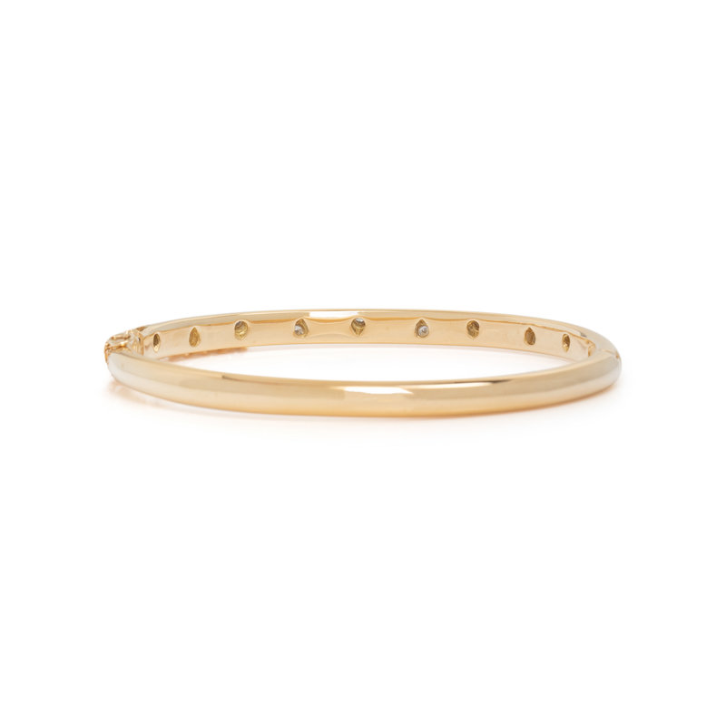 Round brilliant cut diamonds weighing approximately 0.30 carat total, hinged with side clasp. 18 karat yellow gold and platinum. 6 1/2 inches inner circumference.