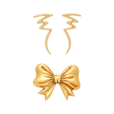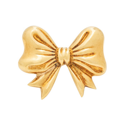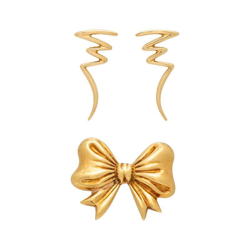 Consisting of a bow brooch and pair of Paloma Picasso earrings. 18 karat yellow gold. Earrings: 1 1/2 inches long. Brooch: 1 1/2 x 1 1/4 inches.