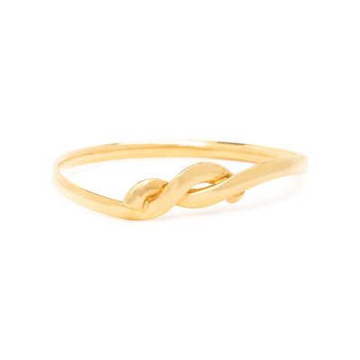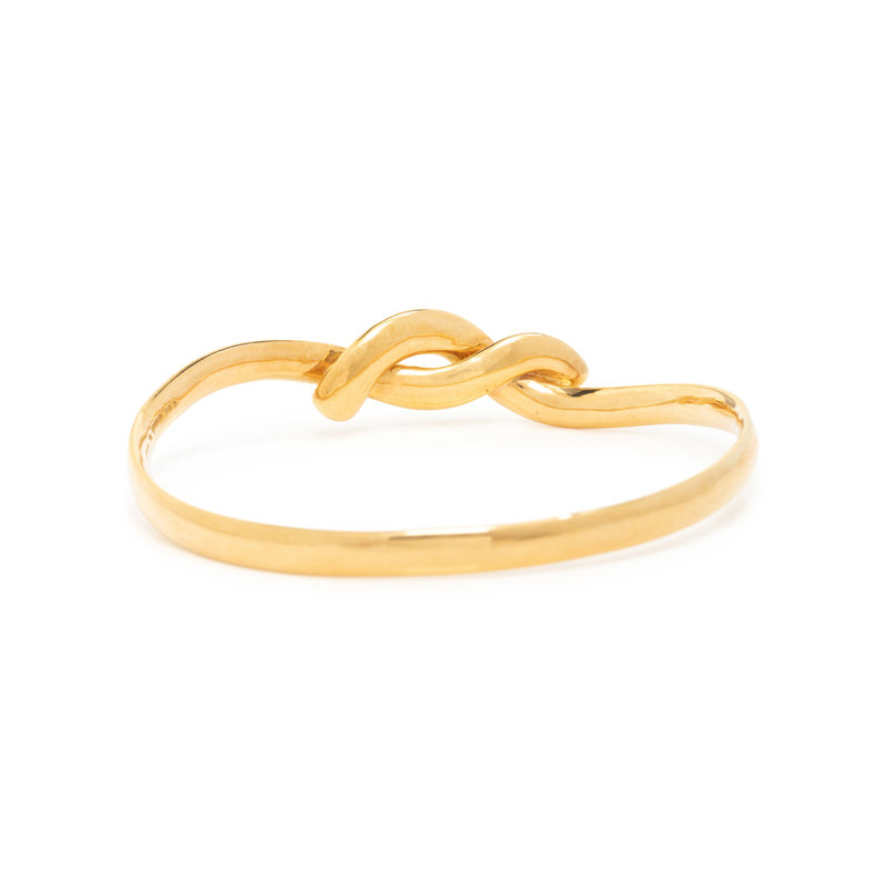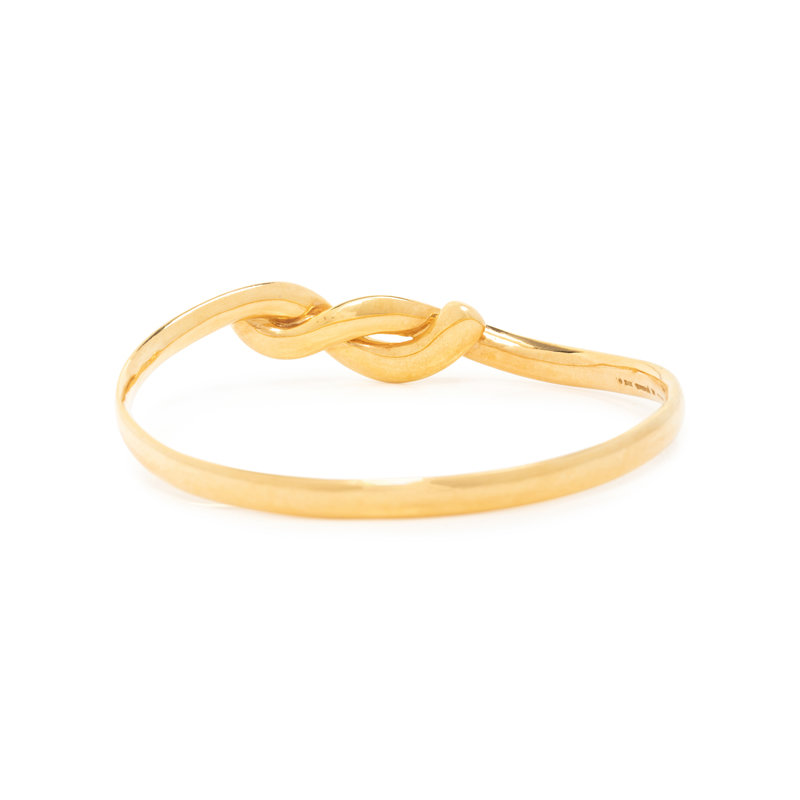 In a knot motif, measuring approximately 5.25 mm wide. Mounted in 18 karat yellow gold. 7 1/2 inches inner circumference.