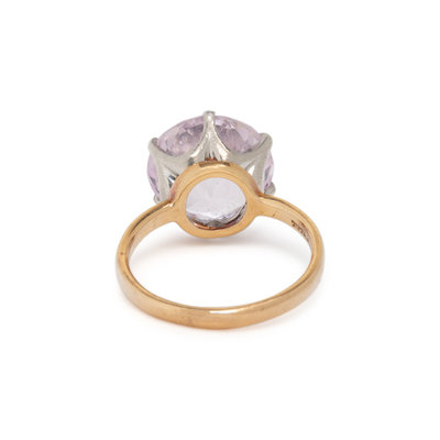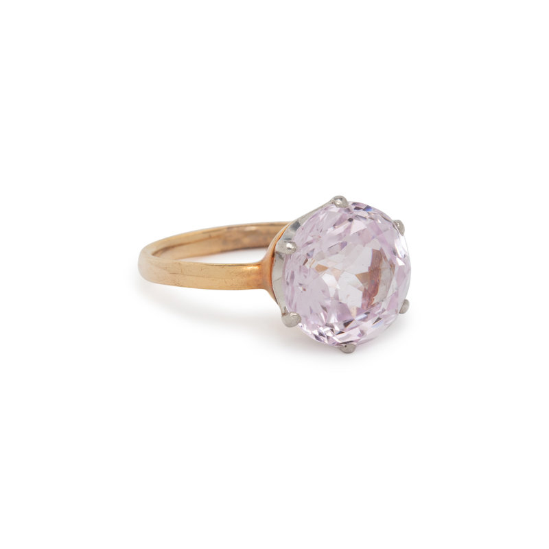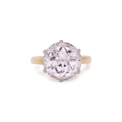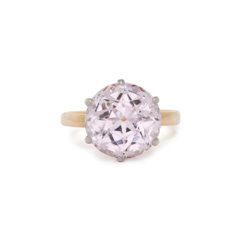 Round mixed cut kunzite measuring approximately 10.15 x 10.30 x 7.10 mm. 18 karat yellow gold and platinum. Ring size 3 1/2.