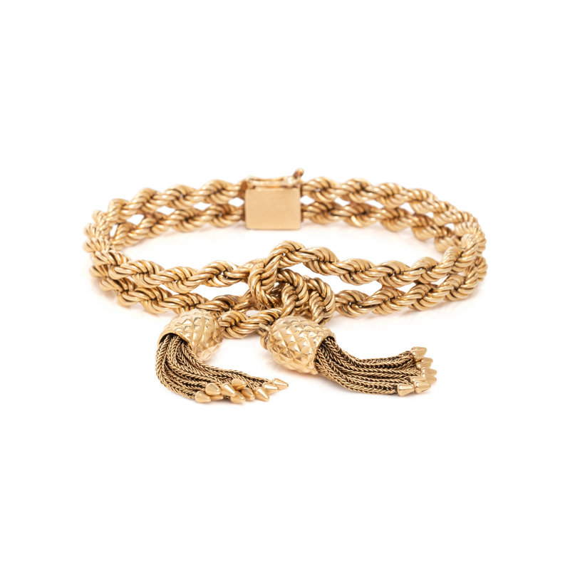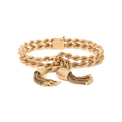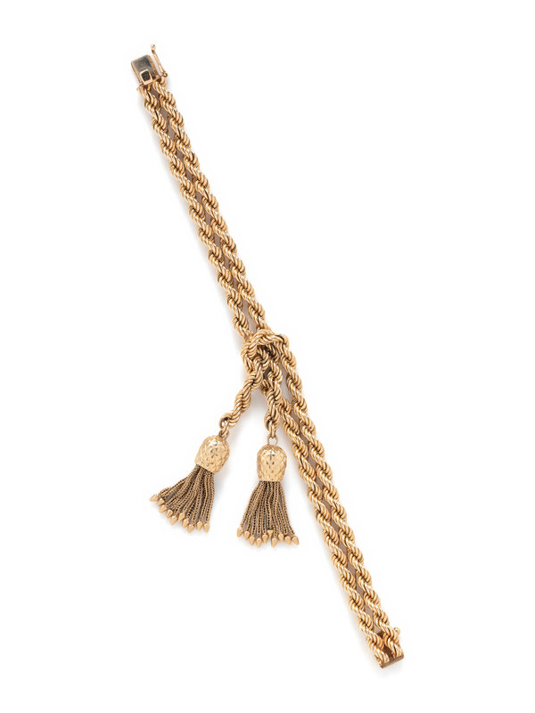 In a two-tiered rope design with tassel. Mounted in 14 karat gold. 7 inches long.