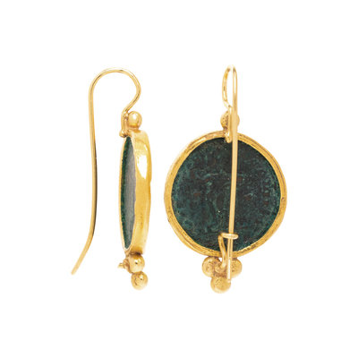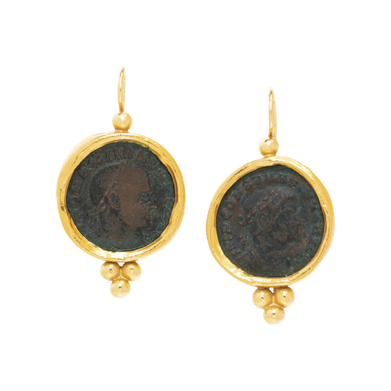 Containing coins, within a gold surround. Mounted in 14 karat yellow gold. 1 1/2 inches long.