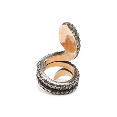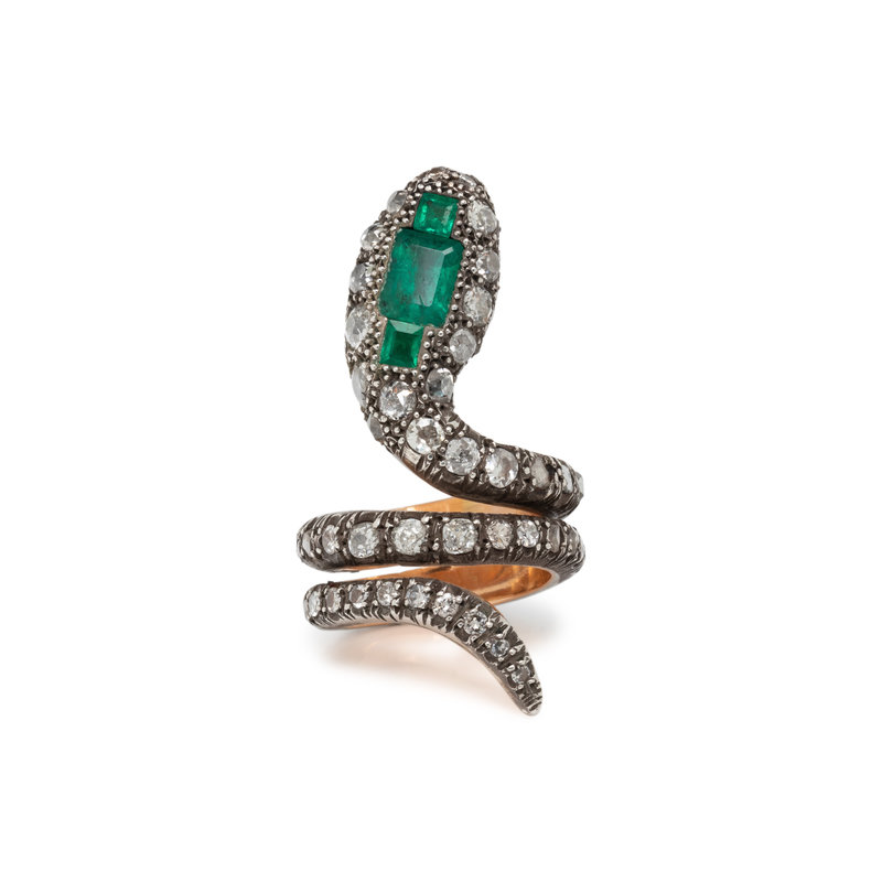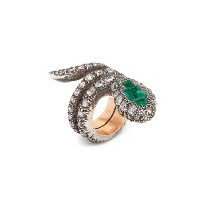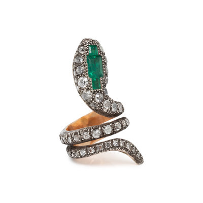 SILVER-TOPPED GOLD, EMERALD AND DIAMOND SNAKE RING