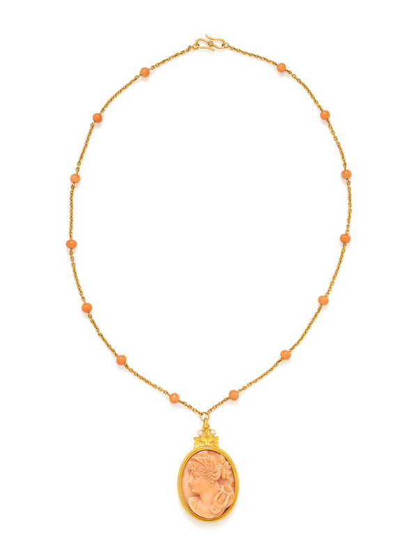 Cable link chain interspersed with coral beads and suspending a pendant containing one oval carved coral cameo measuring approximately 31.75 x 25.00 mm and two seed pearls. 14 karat yellow gold. 18 inches long.
