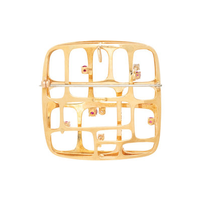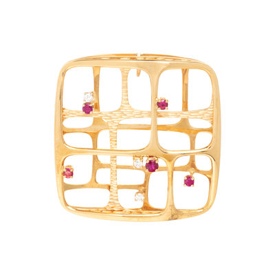 MODERNIST, YELLOW GOLD, RUBY AND DIAMOND PENDANT/BROOCH