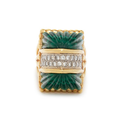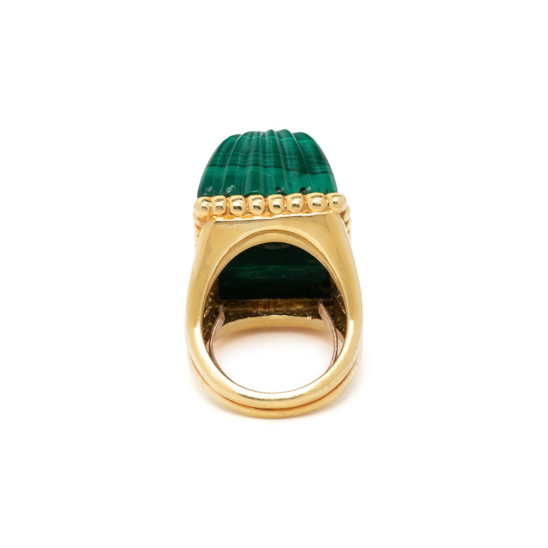 Consisting of a high domed carved malachite decorated with round brilliant cut diamond weighing approximately 1.00 carat total, gold bead work and openwork gold shoulders. 18 karat yellow gold. Ring size 6 3/4.