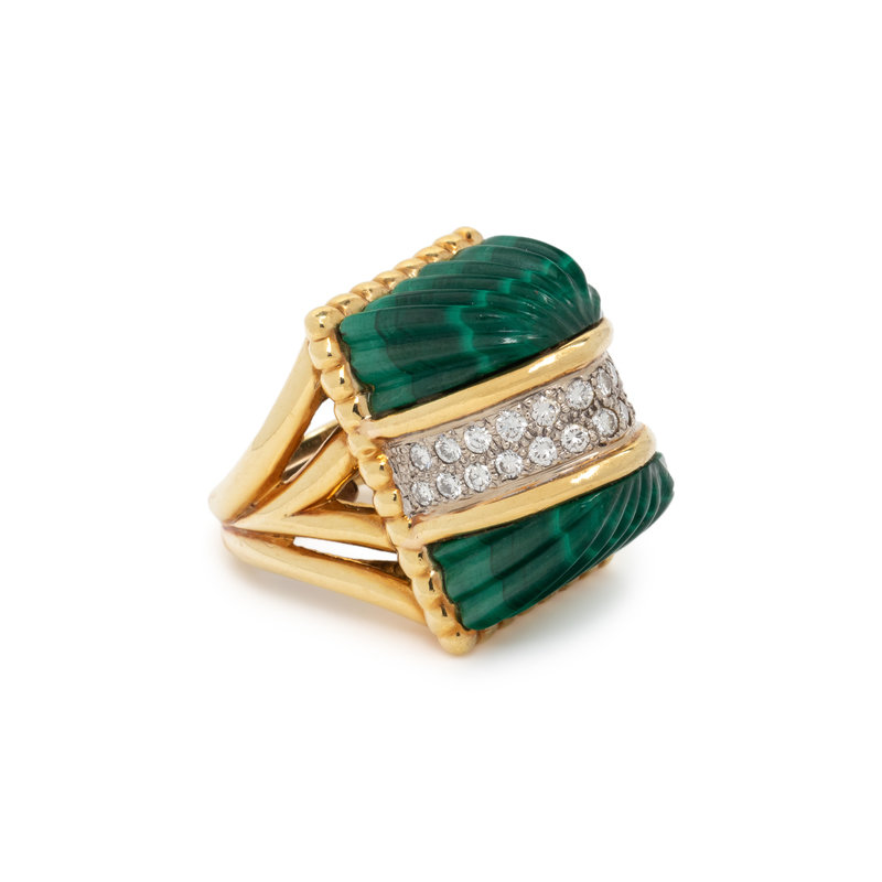 R. STONE, YELLOW GOLD, DIAMOND AND MALACHITE RING