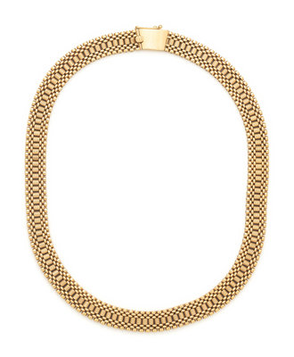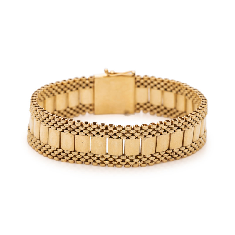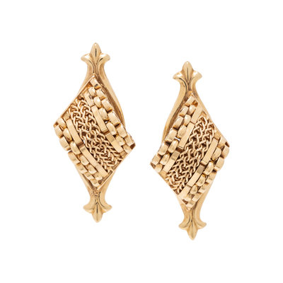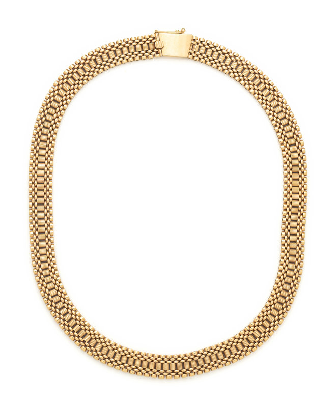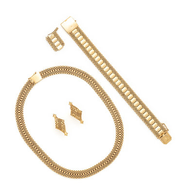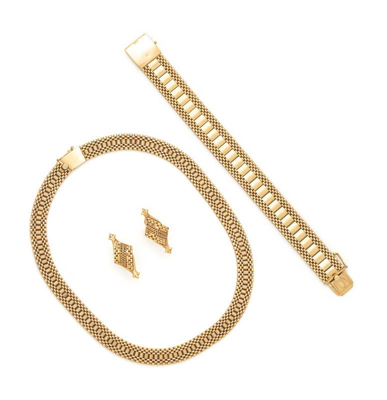Consisting of a necklace, earclips and bracelet, with extra links. 14 karat yellow gold. Necklace: 15 inches long, 9.50 mm wide. Bracelet: 7 inches long, 15.00 mm wide. Earclips: 1 1/4 inches long.