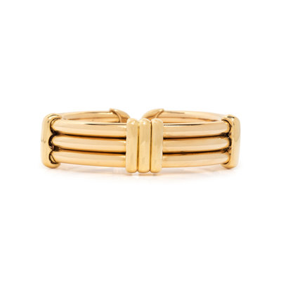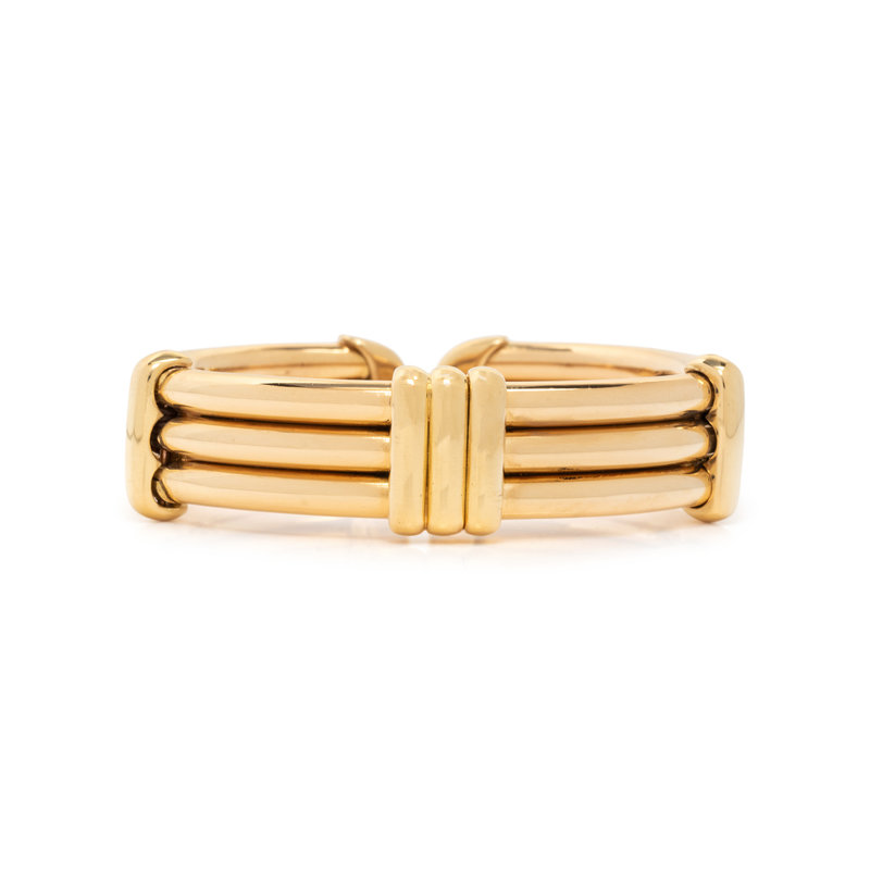 In a ribbed cuff design measuring approximately 13.00-16.00 mm wide, with inner metal tension bar, hinged at sides. 18K yellow gold. 5 1/2 inches inner circumference.