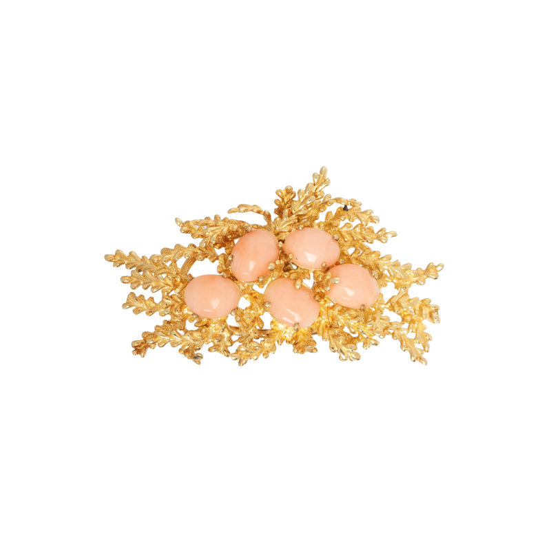 YELLOW GOLD AND ANGEL SKIN CORAL BROOCH