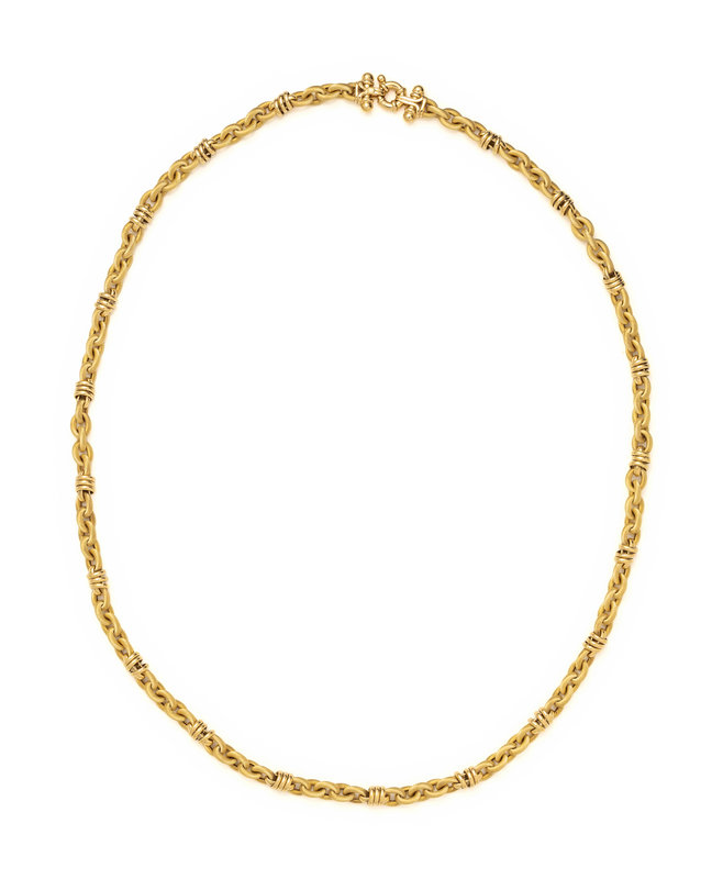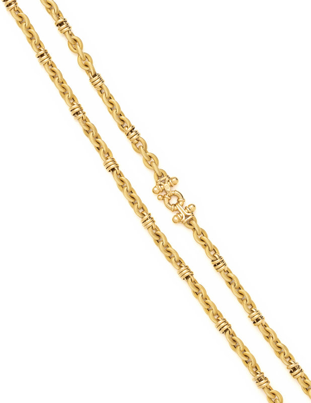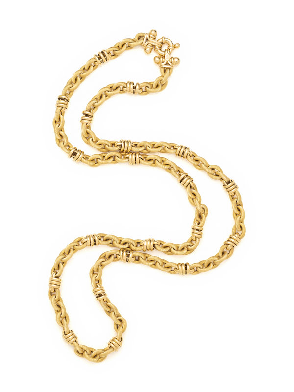 Consisting of a hollow-form textured and polished cable link chain measuring approximately 9.00 mm wide. 32 inches long.