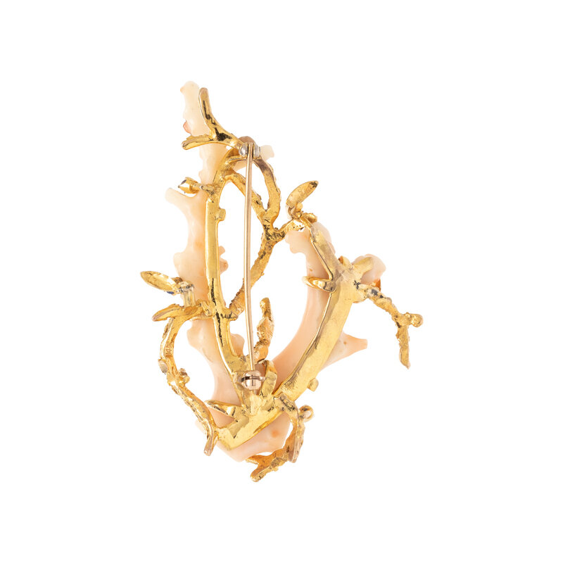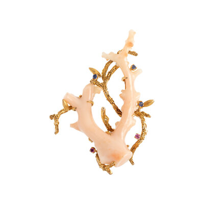 Containing a coral branch decorated with three round brilliant cut sapphires and two round brilliant cut rubies. Mounted in 14 karat yellow gold. 2 1/2 x 2 inches.