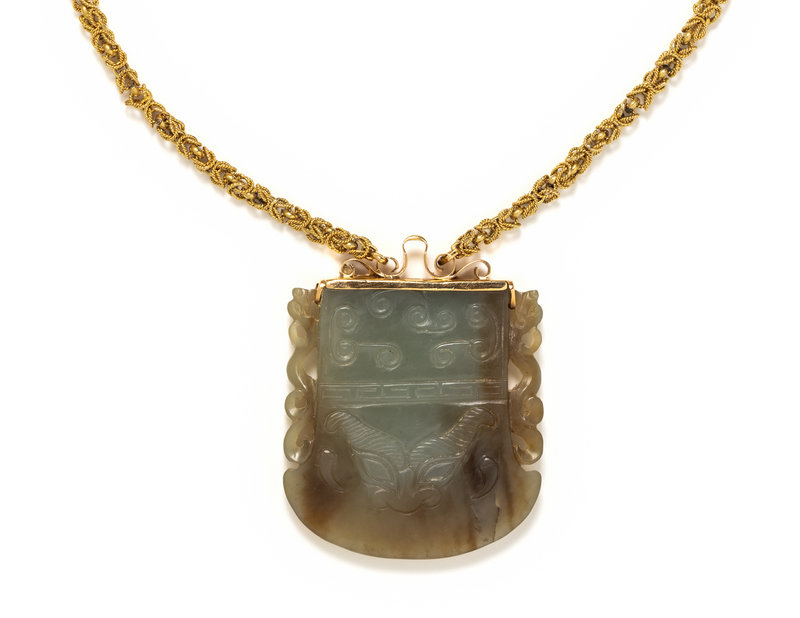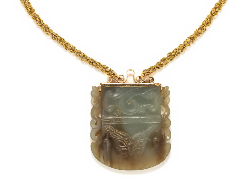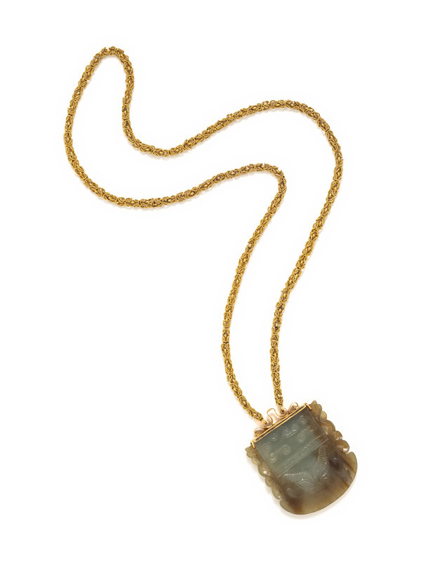 Consisting of a fancy link chain measuring approximately 5.00 mm wide suspending a carved and pierced jade pendant. Chain: 31 inches long. Pendant: 2 1/2 x 2 inches long.