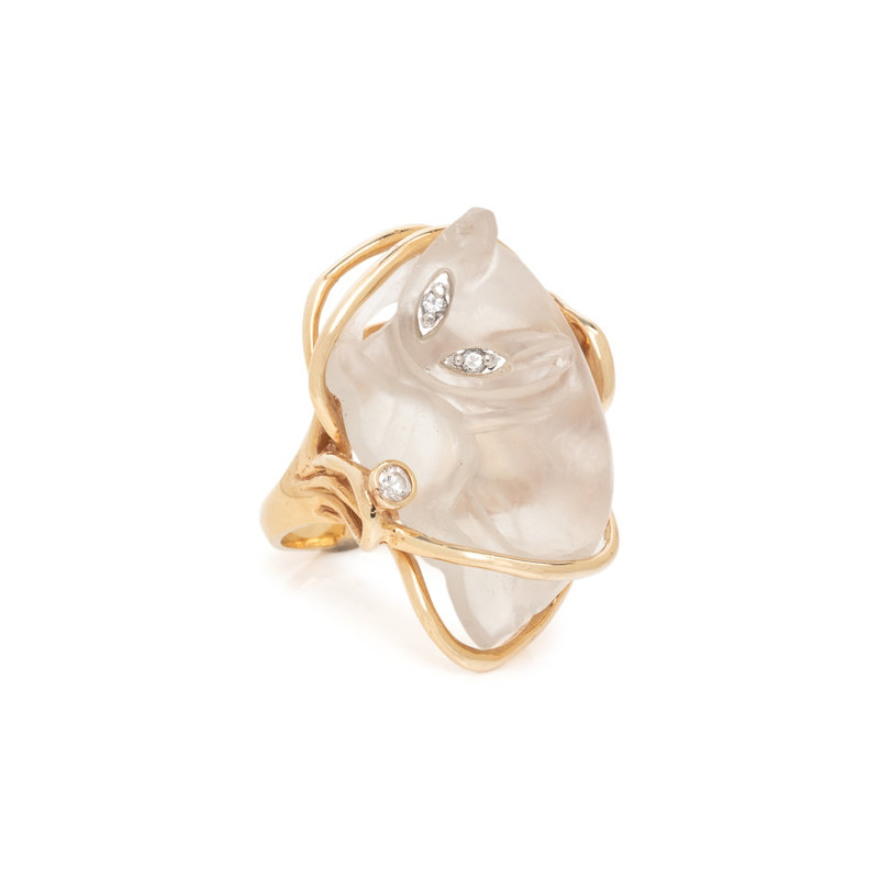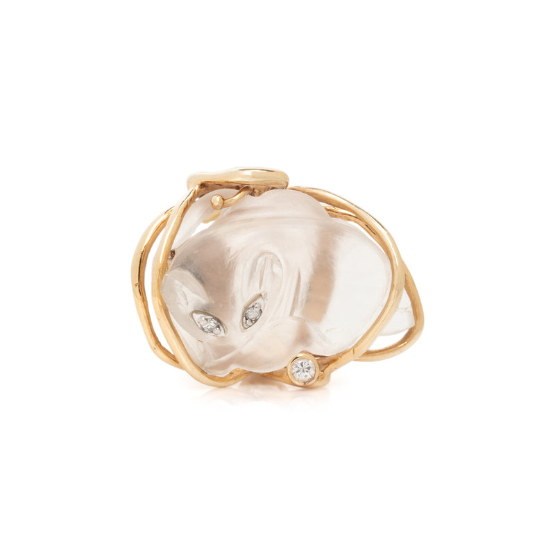 Consisting of a carved rock crystal cat with diamond eyes. Mounted in 14 karat yellow gold. Ring size 6 3/4.