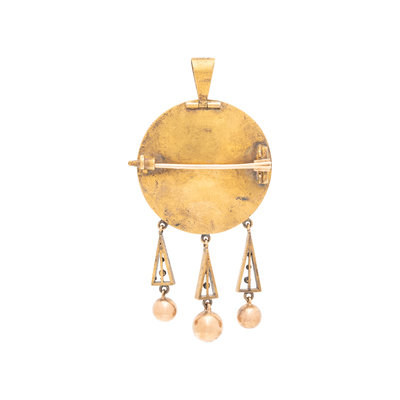 Consisting of a pendant/brooch and matching pair of earrings depicting swans in a pond. Mounted in 14 karat yellow gold. Pendant/Brooch: 2 1/2 inches long. Earrings: 7/8 inch long.