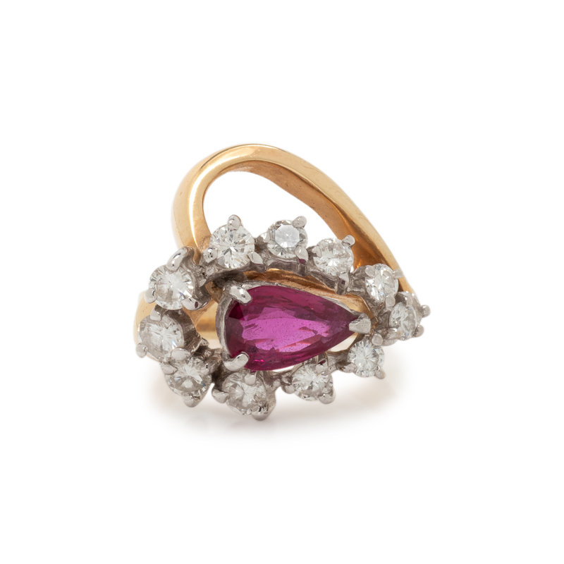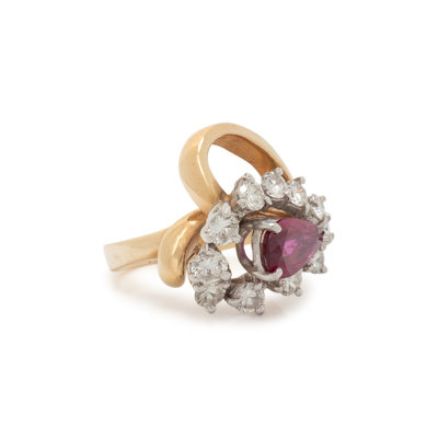 One pear shaped ruby measuring approximately 8.25 x 5.15 mm and round brilliant cut diamonds weighing approximately 0.75 carats total. 14 karat bicolor gold. Ring size 3 3/4.