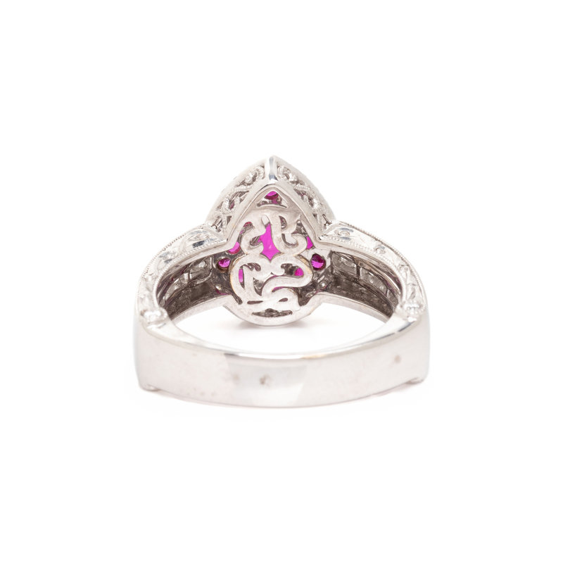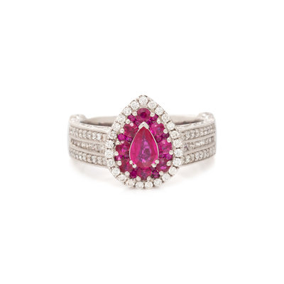 Containing numerous round brilliant cut diamonds, round brilliant and pear cut rubies. Ring size 7.