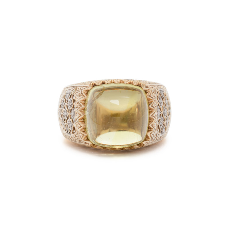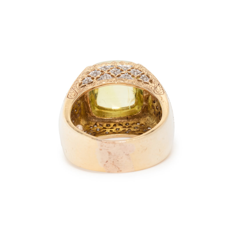 Cushion shaped cabochon peridot and round brilliant cut diamonds. 18 karat bicolor gold. Ring size 10 1/2.