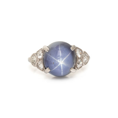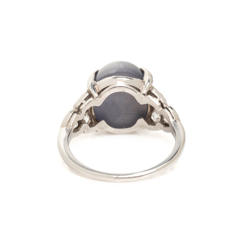 Oval cabochon cut star sapphire measuring approximately 11.00 x 10.40 x 9.00 mm and old European cut diamonds weighing approximately 0.75 carats total. Platinum. Ring size 5 3/4.