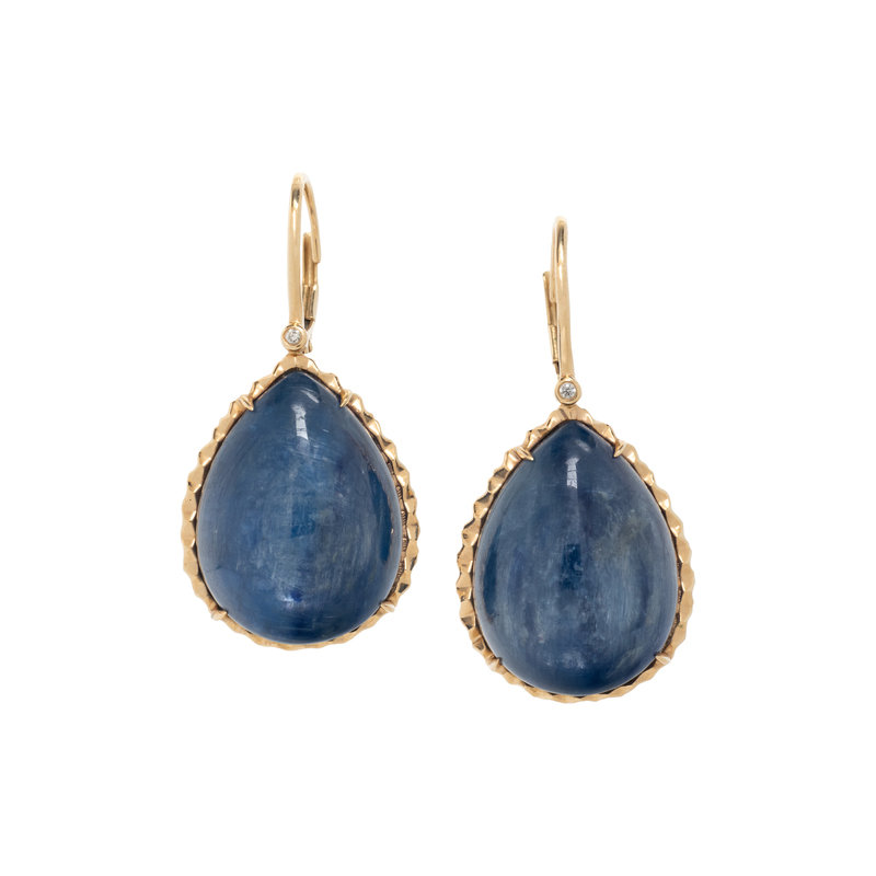 Pear cabochon kyanite and round brilliant cut diamonds. 14 karat yellow gold. 1 3/8 inches long.