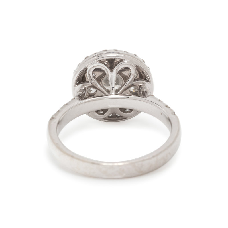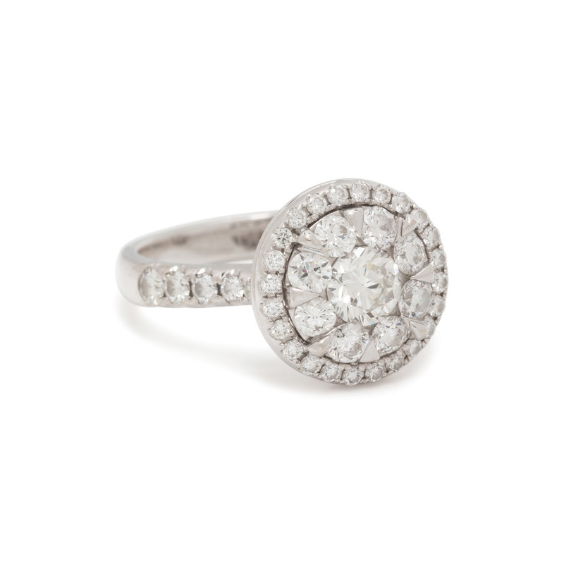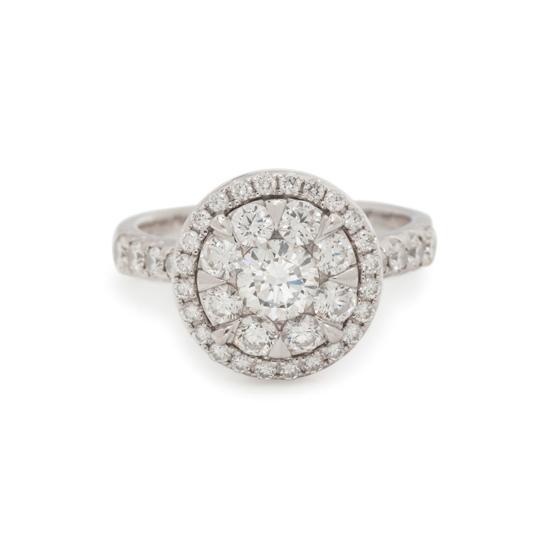 Containing one round brilliant cut diamond weighing approximately 0.45 carat and 42 round brilliant cut diamonds weighing approximately 0.85 carat total. Mounted in white gold. Ring size 7.