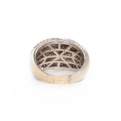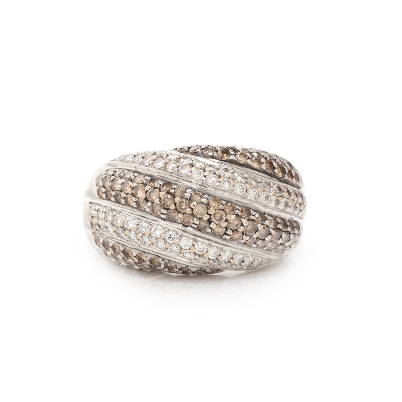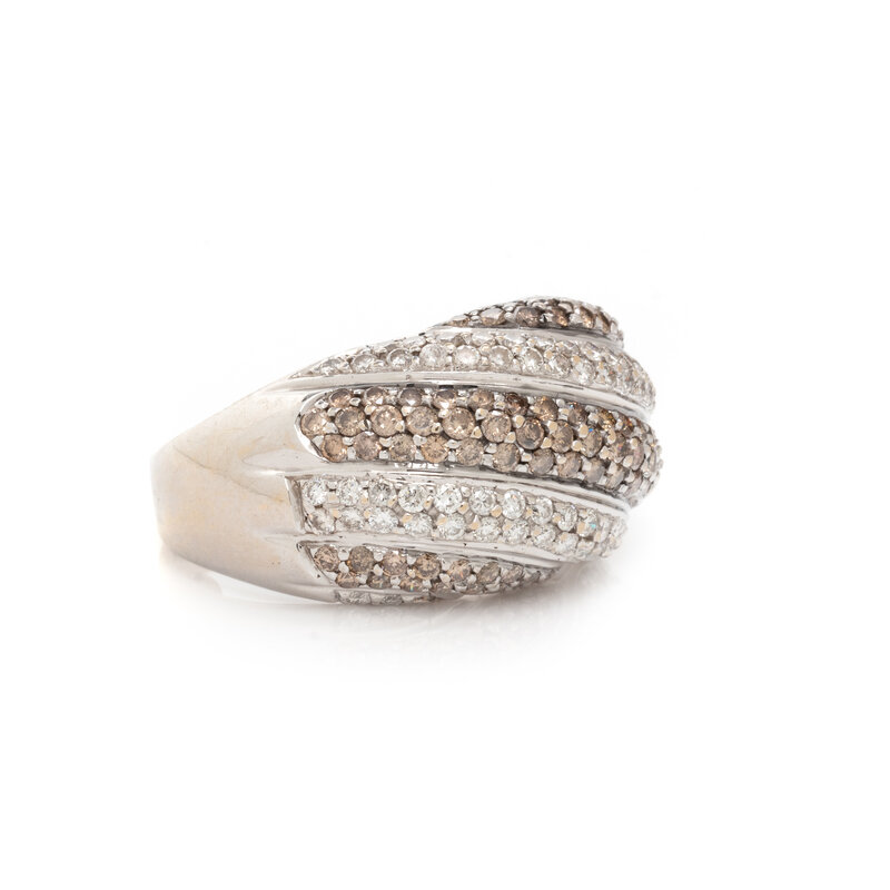 Round brilliant cut diamonds weighing approximately 1.00 carat total and brown diamonds (origin of color not tested) weighing approximately 1.25 carats total. 14 karat white gold. Ring size 8 1/2.