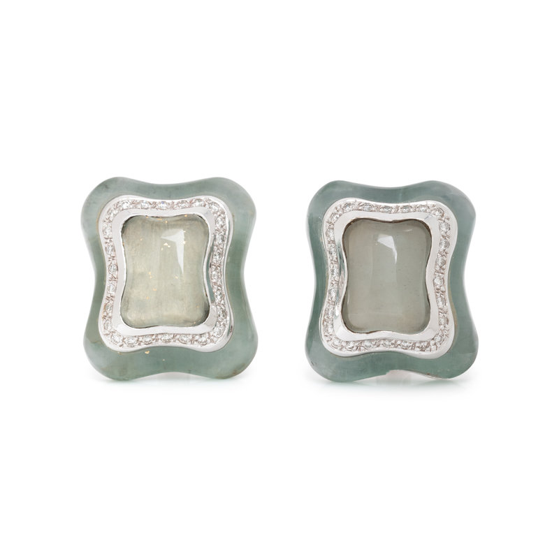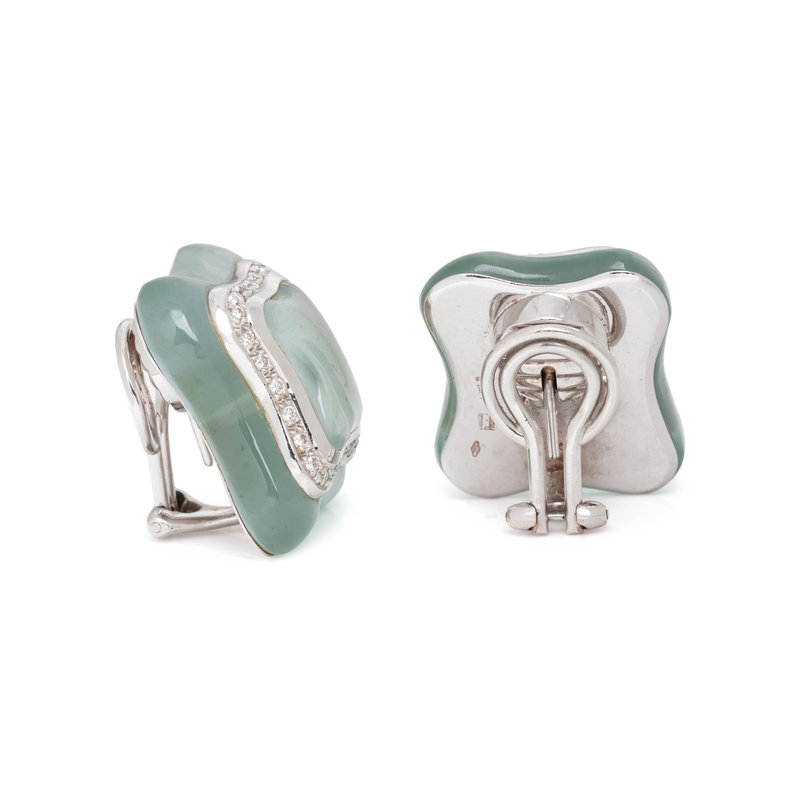 Containing carved and cabochon quartz and round brilliant cut diamonds, folding posts with clip backs. Mounted in 18 karat white gold. 7/8 inch long.