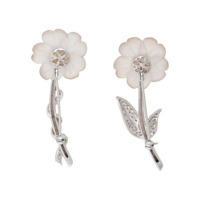 Carved rock crystal flowers and single cut diamonds. 14 karat white gold. 2 inches x 3/4 inch.