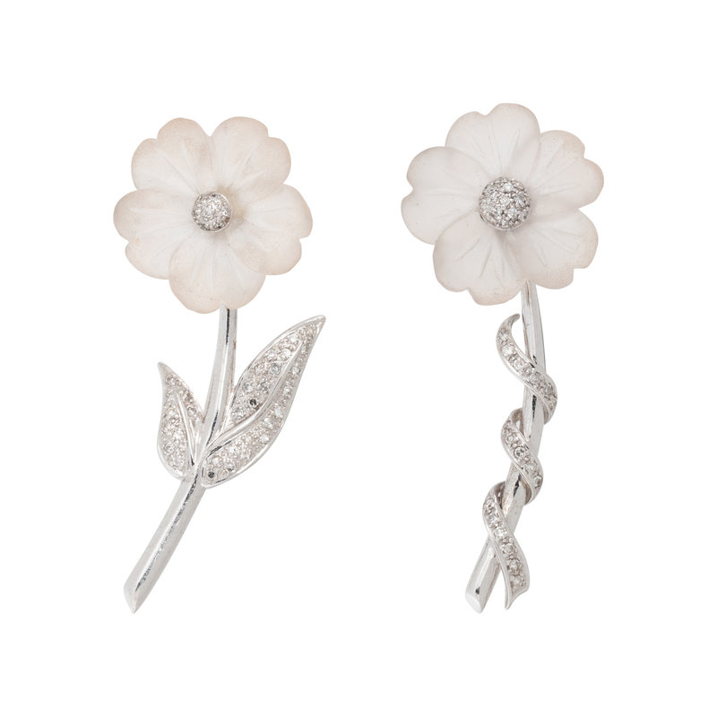 PAIR OF WHITE GOLD, ROCK CRYSTAL AND DIAMOND FLOWER BROOCHES