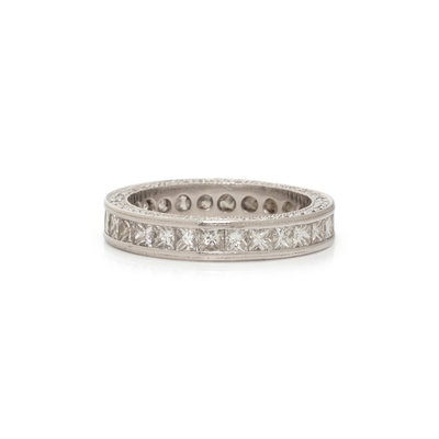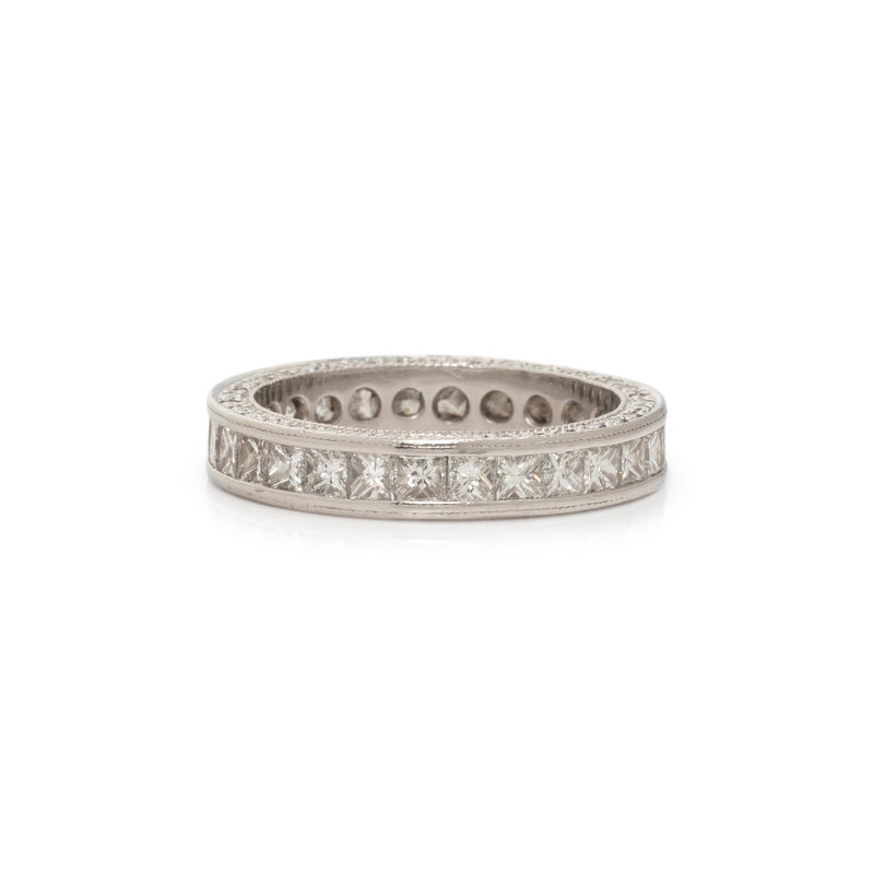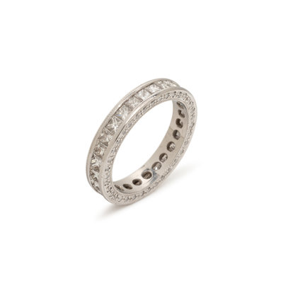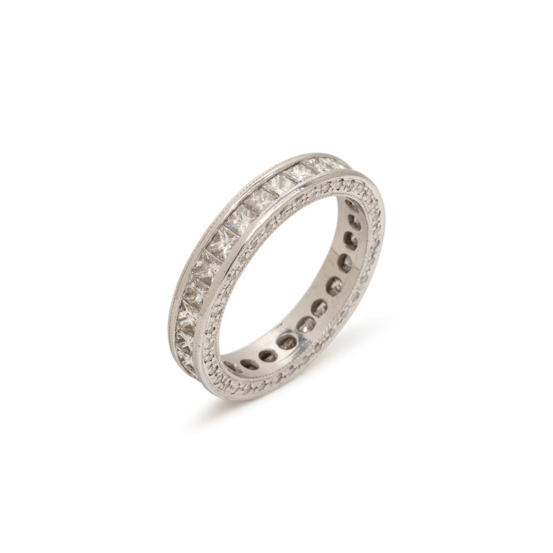 Containing numerous princess and round brilliant cut diamonds approximately 2.60 carats total. Mounted in platinum. Ring size 8.