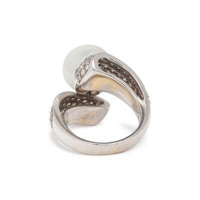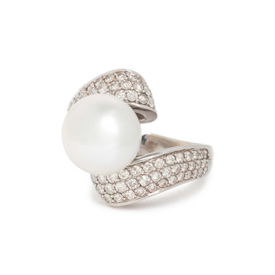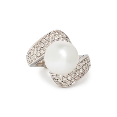 Cultured pearl measuring approximately 13.30 mm and round brilliant cut diamonds weighing approximately 1.65 carats total. 18 karat white gold. Ring size 8.