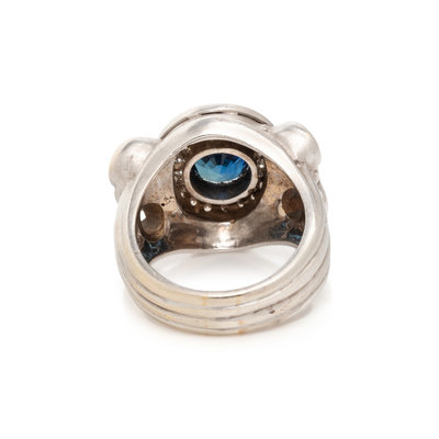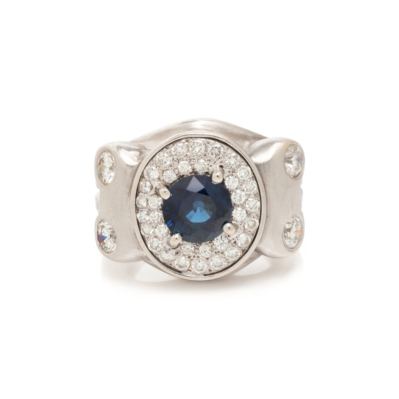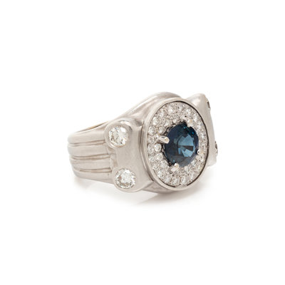 One round mixed cut sapphire measuring approximately 8.50 x 8.55 x 5.25 mm and round brilliant cut diamonds weighing approximately 1.40 carats total. 18 karat white gold. Ring size 10 1/4.