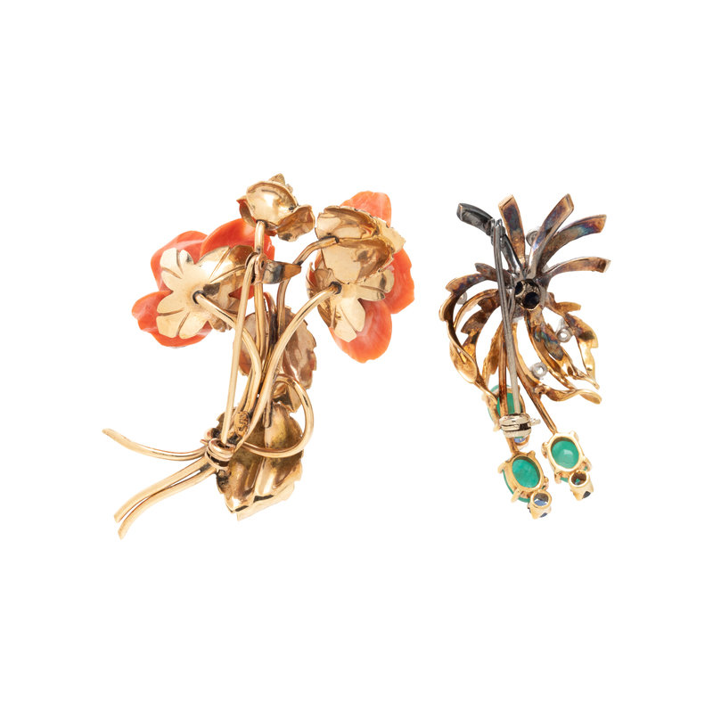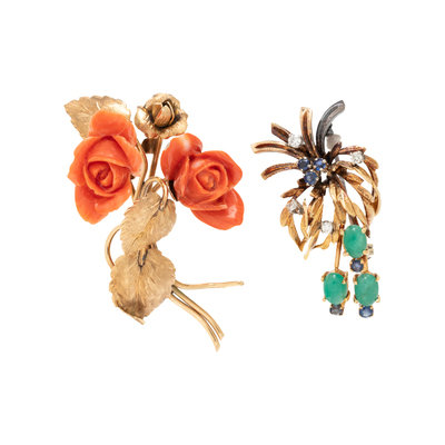 One floral carved coral brooch and one diamond and multigem spray brooch. 2 1/2 inches long and 1 3/4 inches long.