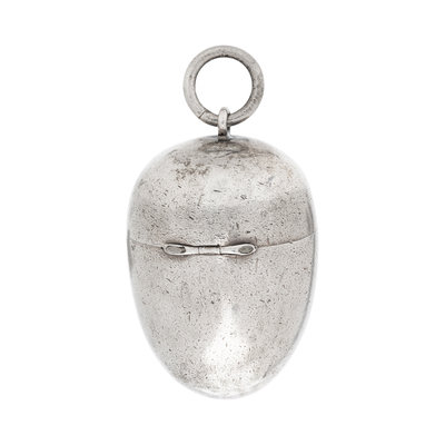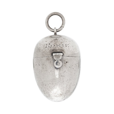 Consisting of an egg shaped locket engraved "Rosie', containing thread spools and pins. 1 3/4 inches long.