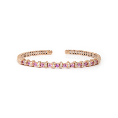 Round mixed cut pink sapphires and round brilliant cut diamonds. 18 karat rose gold with interior tension bar. 6 3/4 inches inner circumference.