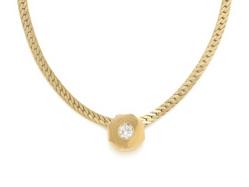 Curb link chain measuring approximately 5.00 mm wide with slide charm containing one old European cut diamond weighing approximately 1.00 carat. 14 karat yellow gold. 18 1/4 inches long.
