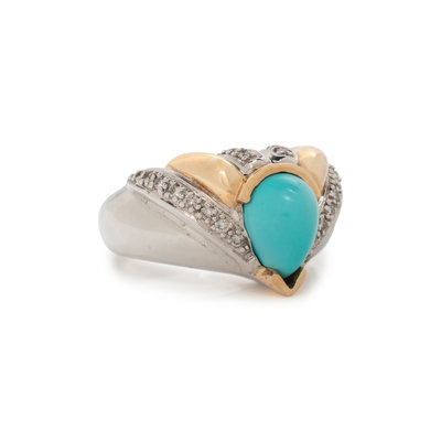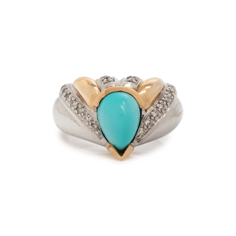 Pear shaped turquoise cabochon and round brilliant cut diamonds. 14 karat bicolor gold. Ring size 6 3/4.