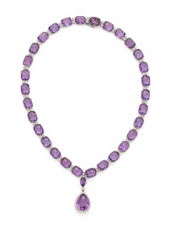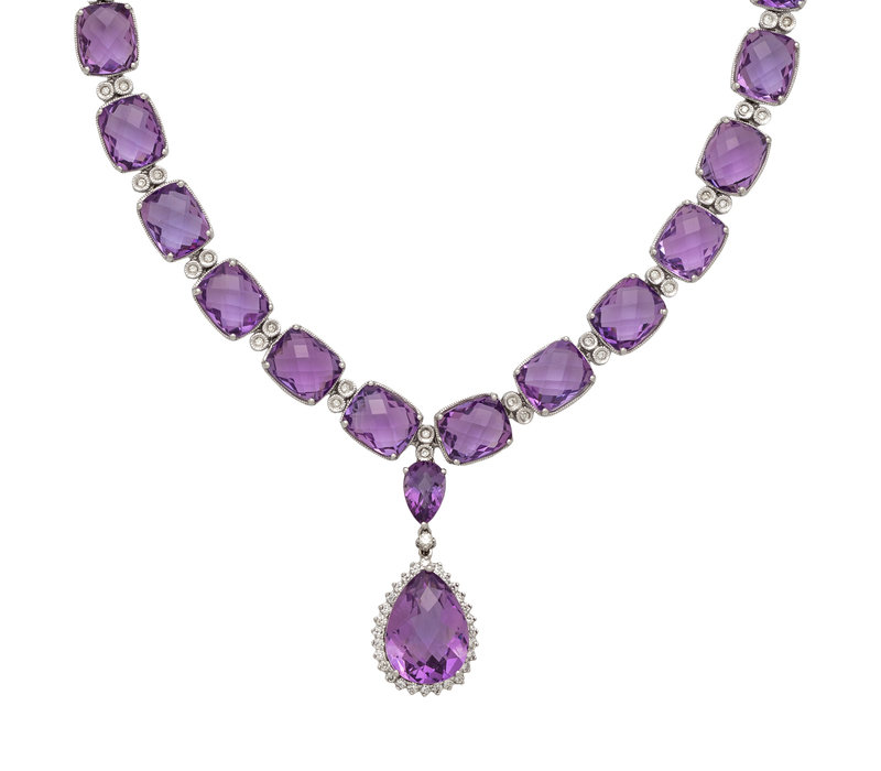 Pear and cushion shaped checkerboard cut amethyst and round brilliant cut diamonds weighing approximately 1.30 carats total. 14 karat white gold. 16 inches long.