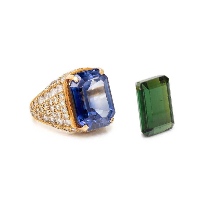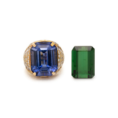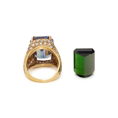 Containing an emerald cut synthetic sapphire measuring approximately 17.90 x 13.85 x 8.80 mm and 94 round brilliant cut diamonds weighing approximately 2.25-2.75 carats, together with a green tourmaline measuring approximately 16.87 x 12.03 x 8.30 mm. Ring size 7.