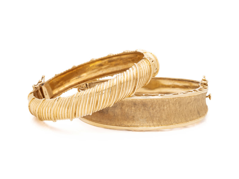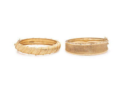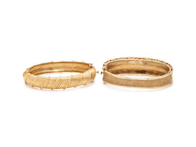 Consisting of two bangles, side hinge with clasp. 6 1/2 inches inner circumference.