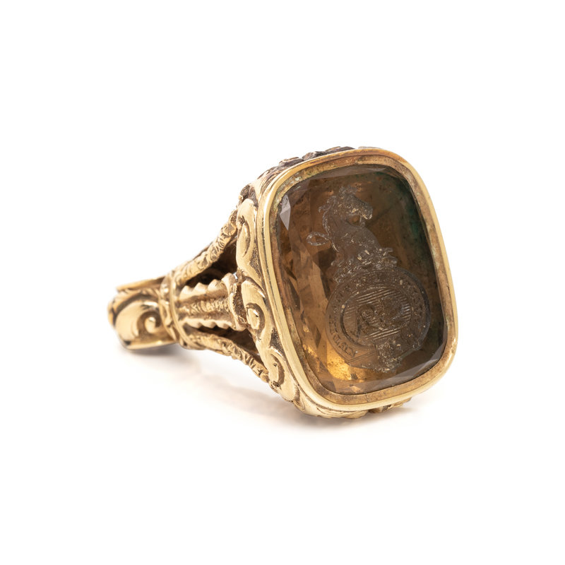 Citrine intaglio seal mounted in 14 karat yellow gold. 1 1/2 inches long.