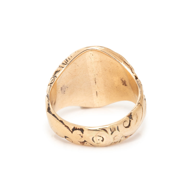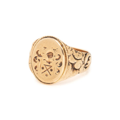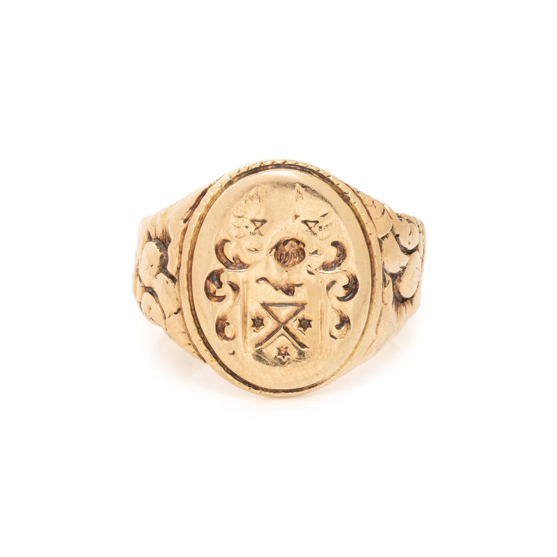 Depicting a coat of arms. 14 karat yellow gold. Ring size 7.